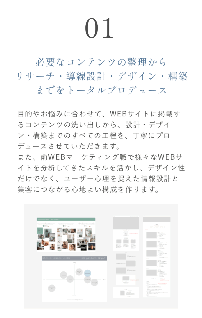 WEBマーケターとしての経験を生かし、見てくださるお客さま目線で考えることを意識しています。ただデザインが綺麗、整っているということだけに留まらず、デザインを見る方の「わかりやすさ」と「伝わりやすさ」を第一に考え、最終的なゴールに導くために制作いたします。